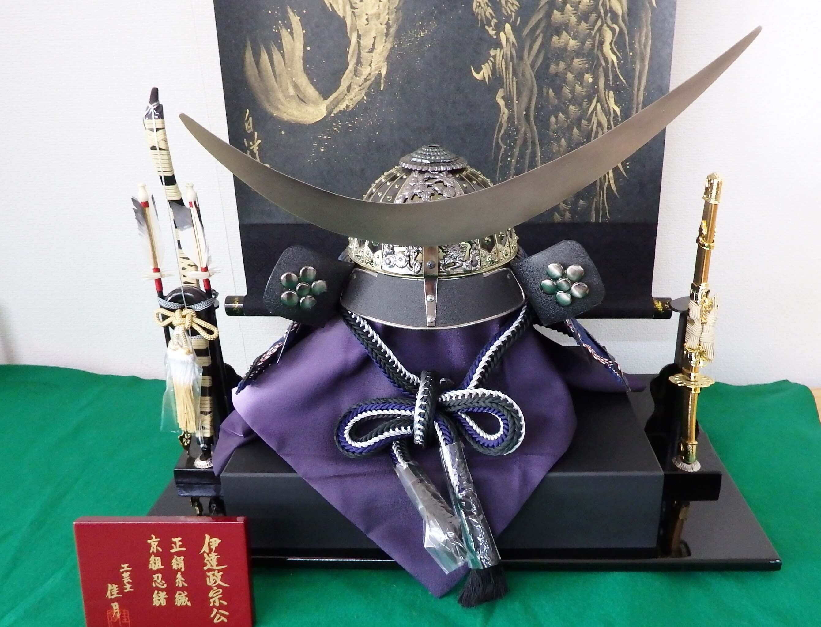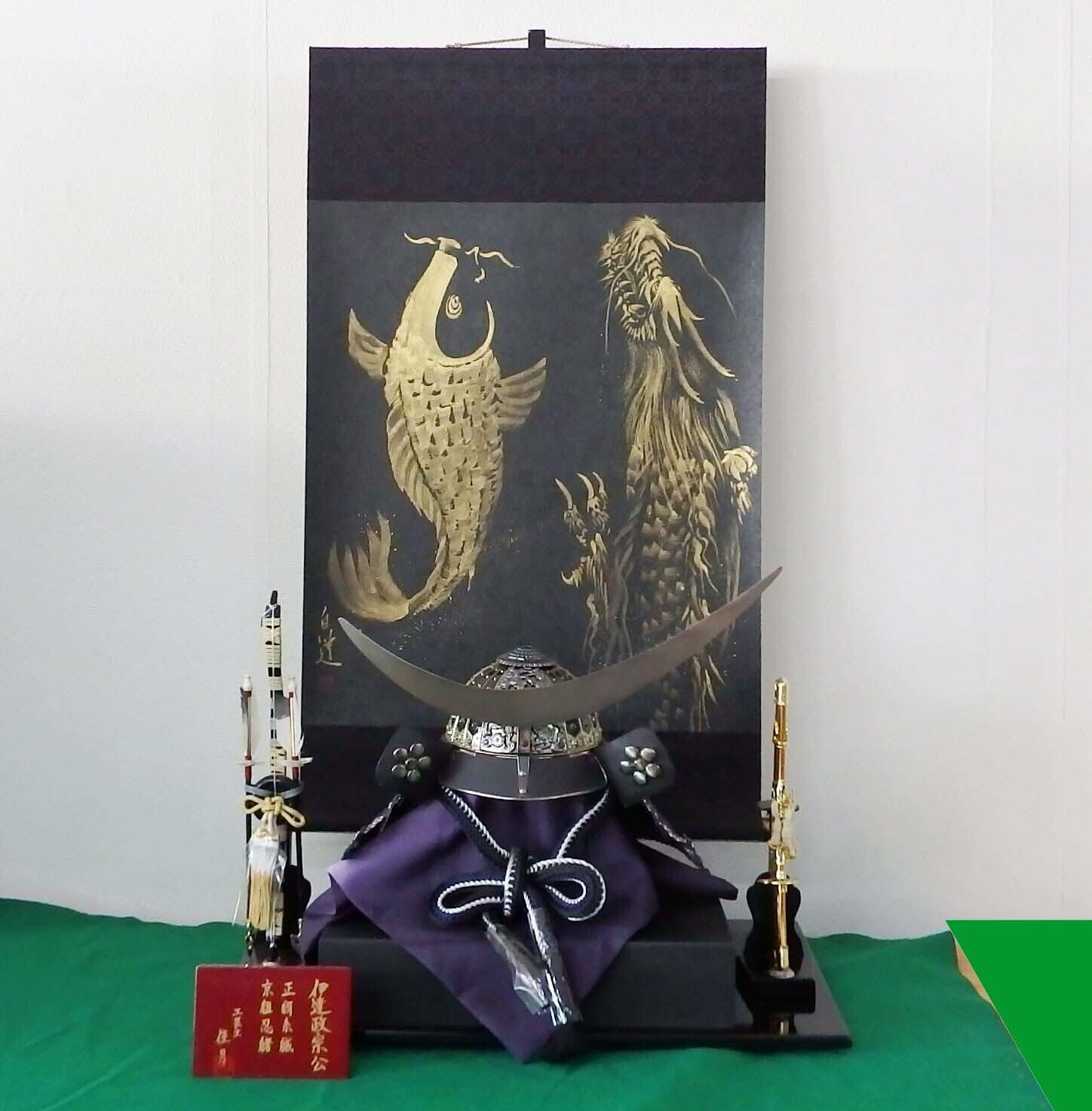 【現品特価)5月の節句 着用兜飾り 兜飾り 伊達政宗仕様 特価品 龍鯉掛軸 オリジナル品 人形のまち岩槻のメーカー品