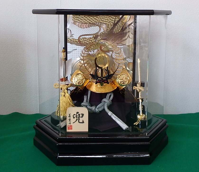 【現品特価)5月の節句 六角形 兜ケース飾り 徳川家康公仕様 特価品 龍背景 アクリルケース 人形のまち岩槻のメーカー製